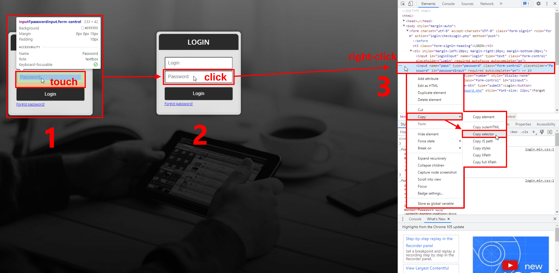 - Then paste the copied CSS selectors for the password (in the example the password field = #passwordinput) into the adjacent field.