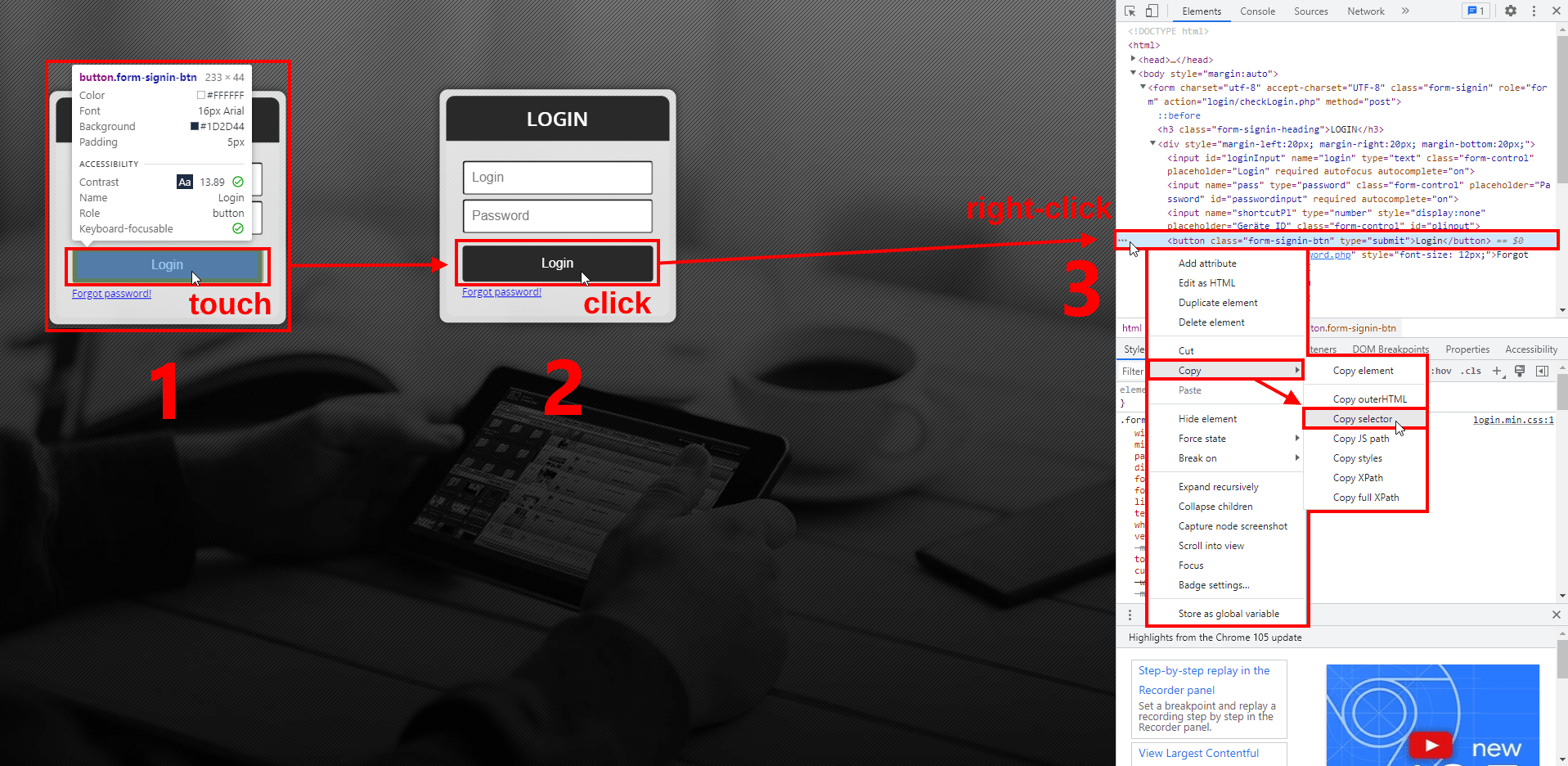 Please copy the text sections and thus the corresponding CSS selectors for the password and the login button in the same procedure as described above.