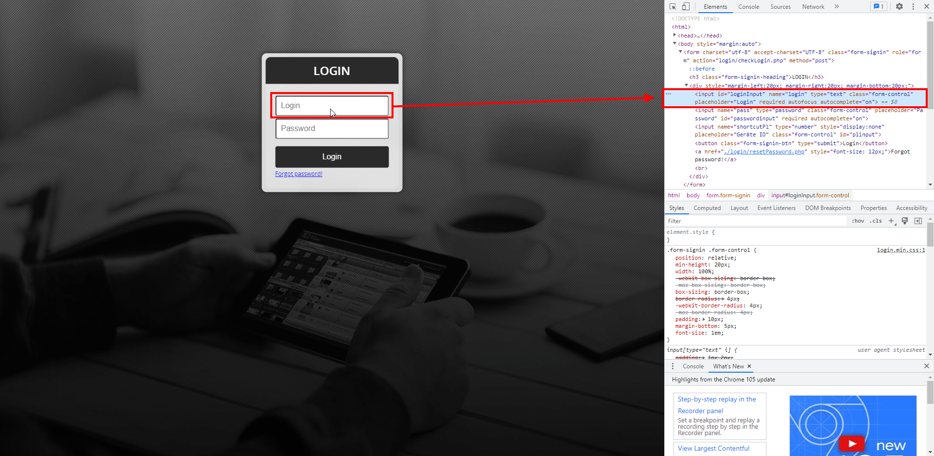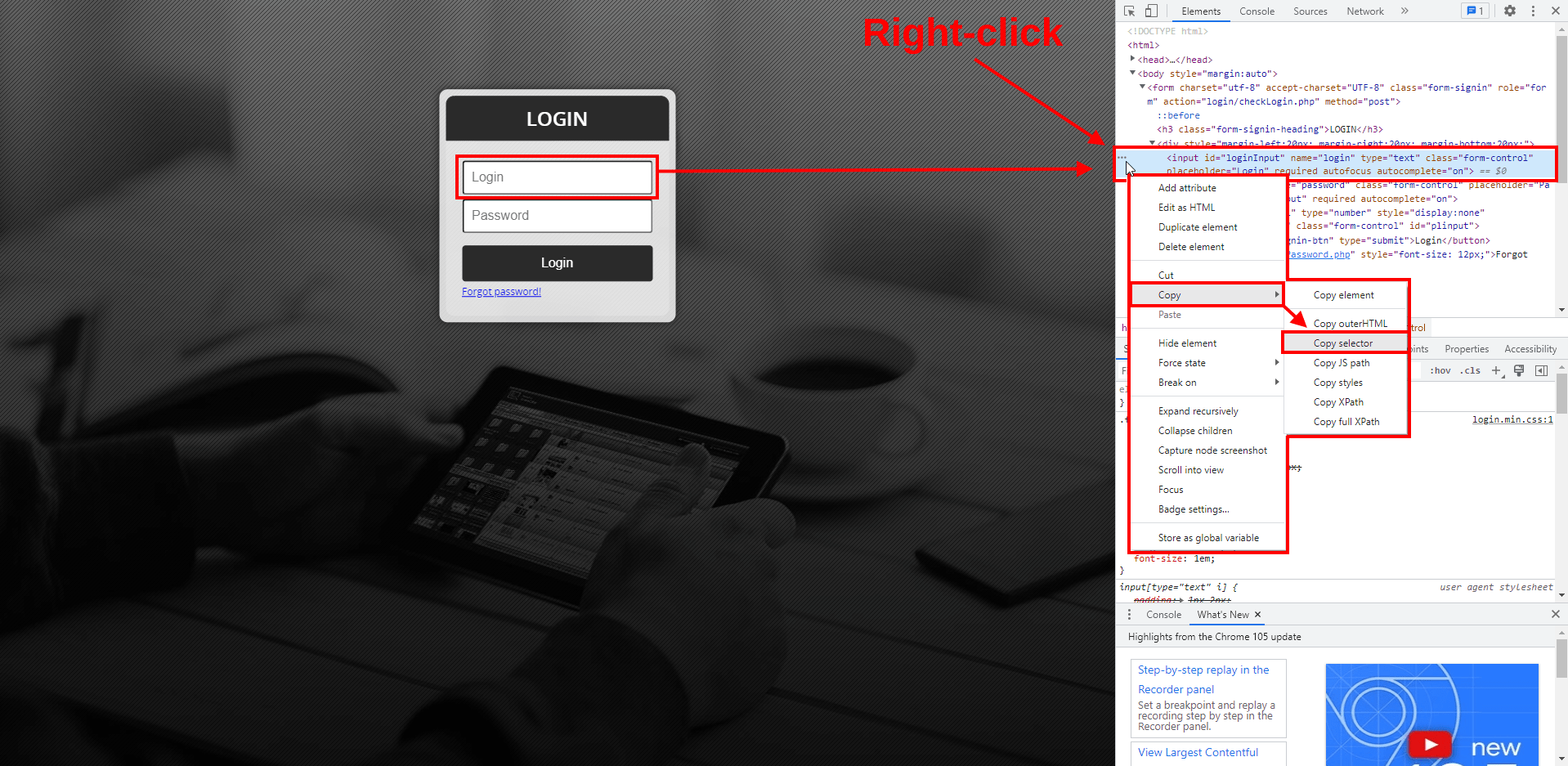 Click in the Login input field.This highlights the corresponding text section with the desired CSS selectors.