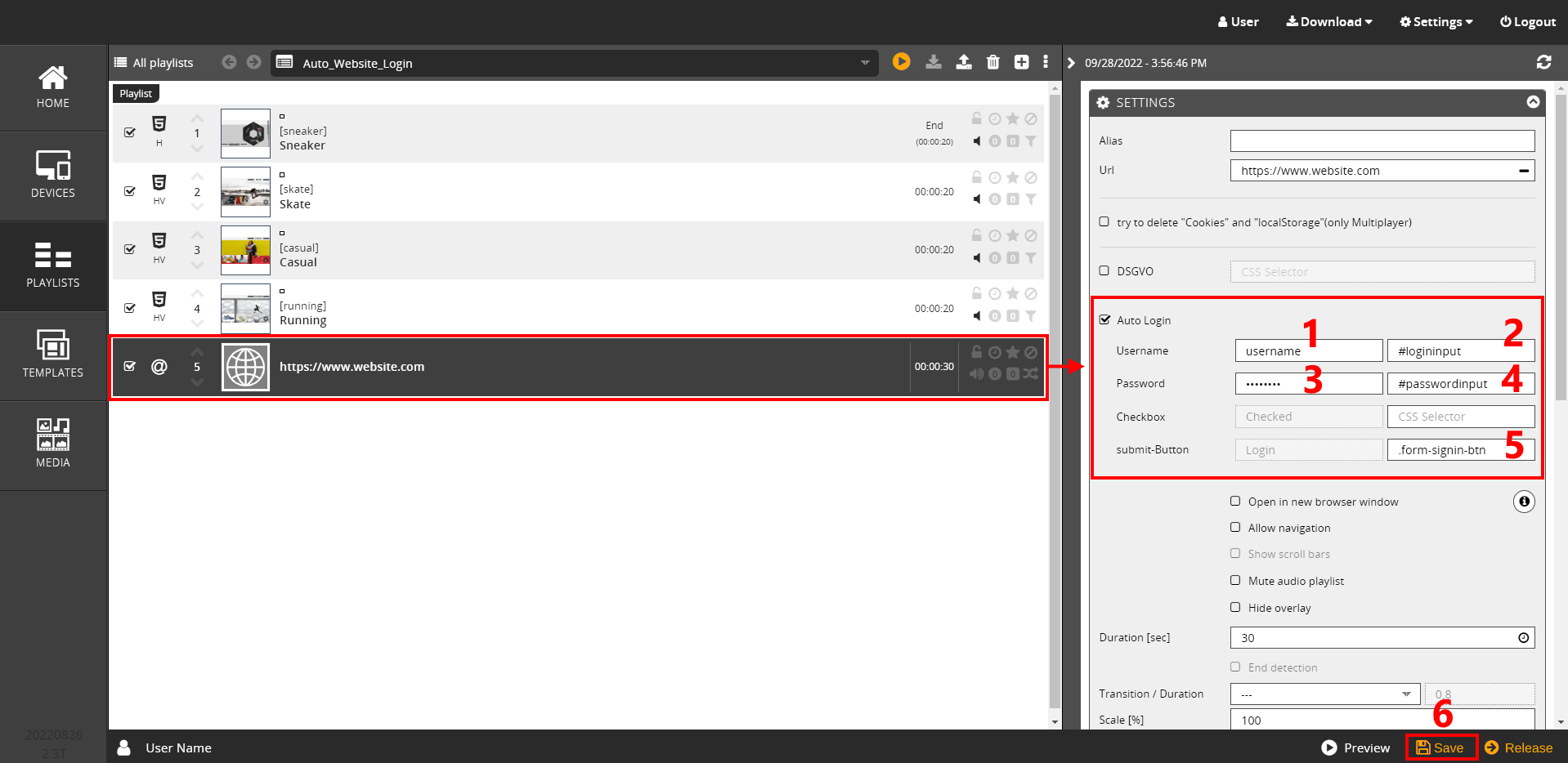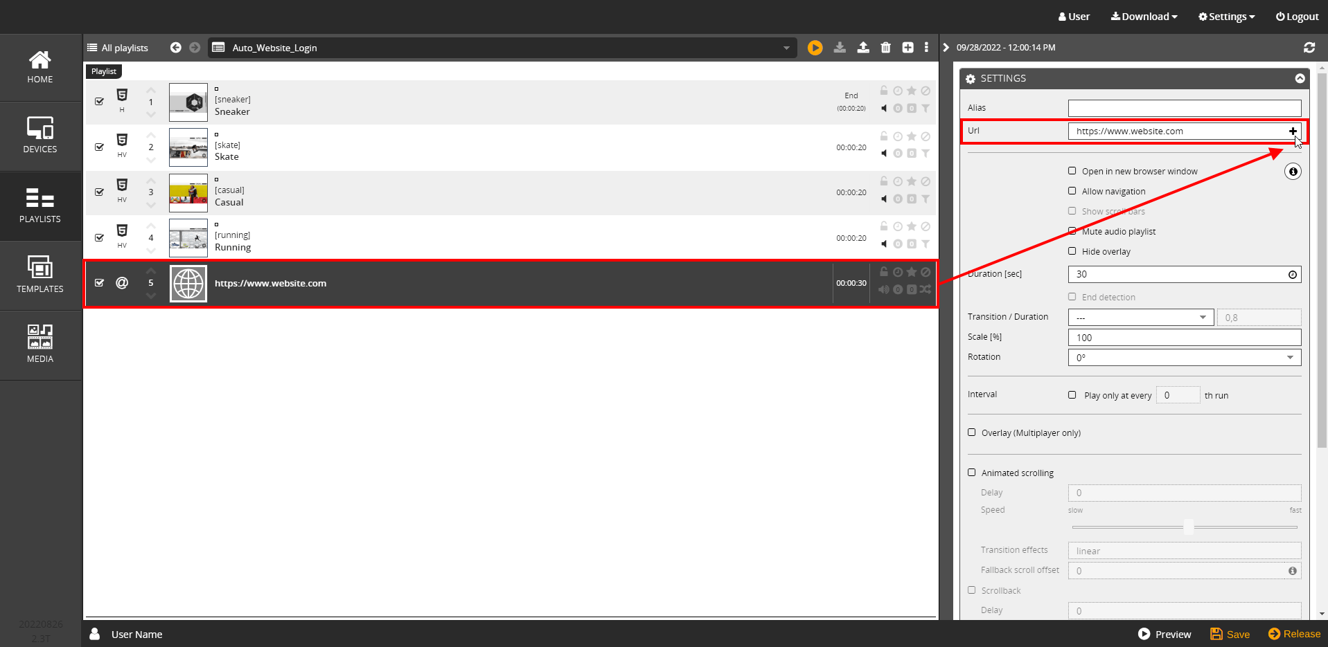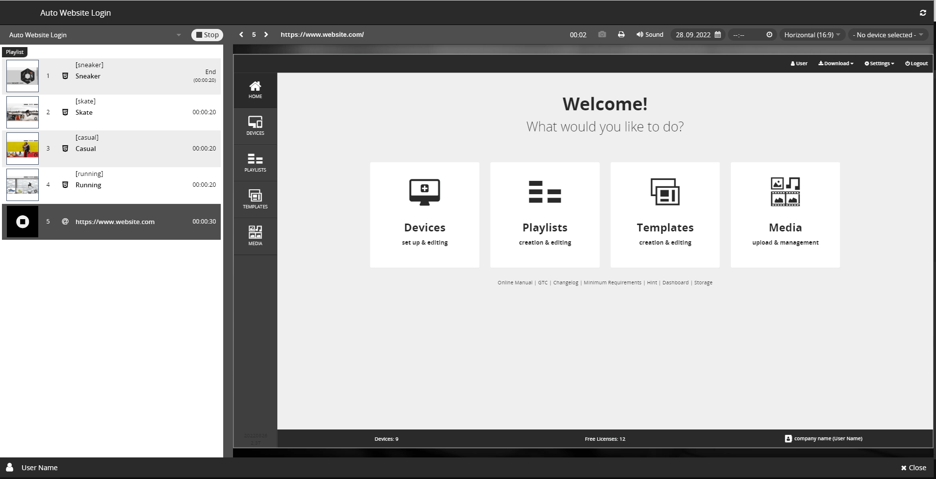 For each relevant playlist element (see in chapter → Add Link/Website/Stream ) you only need to set up the automatic website login once.