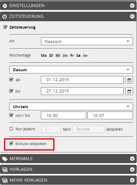 Mit Hilfe der Zeitsteuerung erhalten Sie die Möglichkeit die Laufzeit/Abspielzeit Ihrer Playlisten, wie auch einzelne Inhalte innerhalb einer aufgerufenen Playliste zeitlich zu definieren.