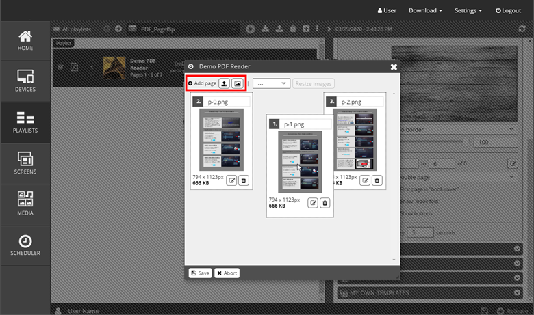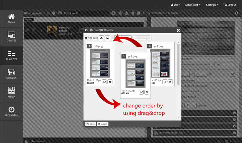 - In the playlist management, upload your PDF to the playlist using the +Symbol → PDF or insert the PDF quickly and easily using drag and drop.